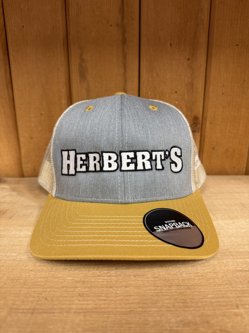 Show your support for Herbert's Boots by rocking this embroidered logo hat! Since 1958 embroidered on the side Snap back Heather Grey, Birch & Amber Gold
