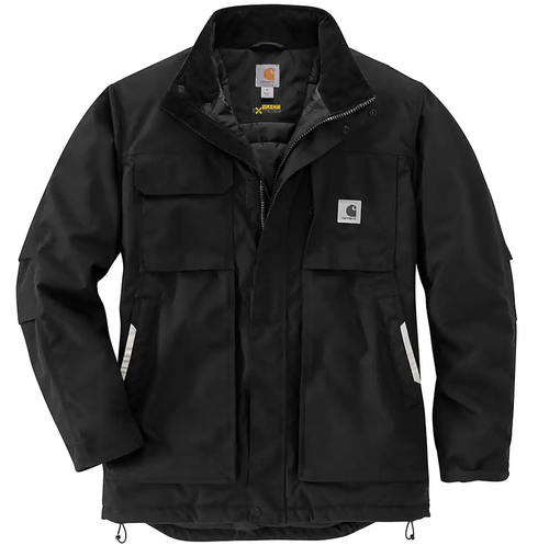 This men's Carhartt coat gives you durable warmth without restricting mobility. Made with an insulated Cordura® shell that fights off cold, wind, abrasion, and light rain. Includes reflective details, extra flex where you need it, and all the pockets you could ask for. Features Full Swing® Technology for stretch across the shoulders, arms that move free without the jacket riding up, and a bigger bend in the elbows.